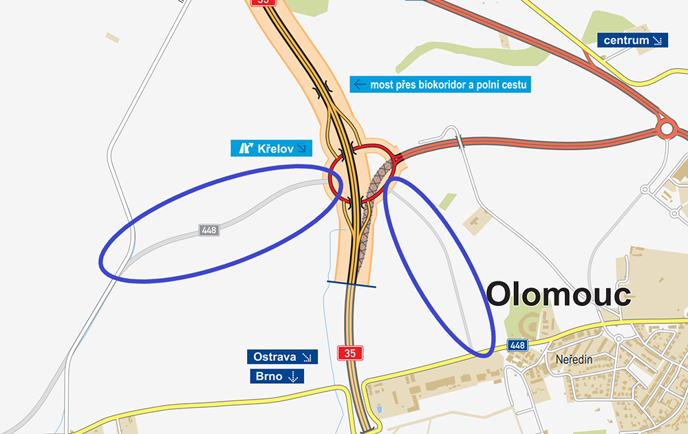 Už pouhý týden zbývá do plného zprůjezdnění nového dálničního úseku D35 u Olomouce, který dokončí západní obchvat města. Součástí stavby je nová mimoúrovňová křižovatka s označením Křelov, která má podobu rozlehlého rondelu a umožní napojení na dálnici od olomoucké části Neředín či obchodní zóny s hypermarketem Globus. Do budoucna je v plánu výstavba dalších silnic, která mají ústit právě do nového kruhového objezdu.