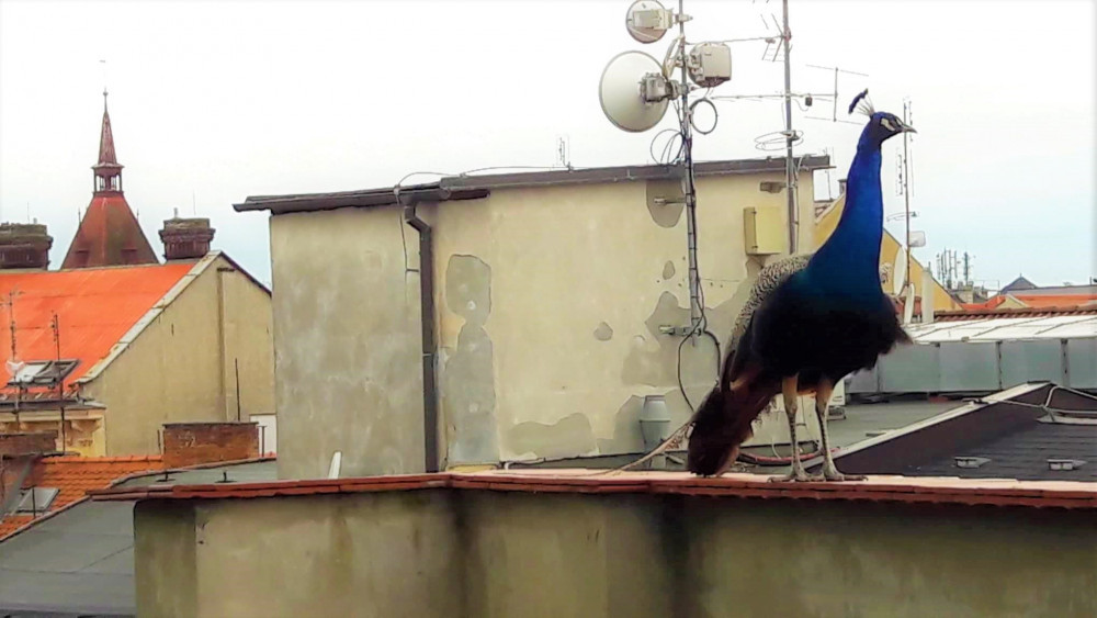 VIDEO: Na střechách domů v Olomouci se pohybuje páv. Strážníky kvůli němu volat nemusíte
